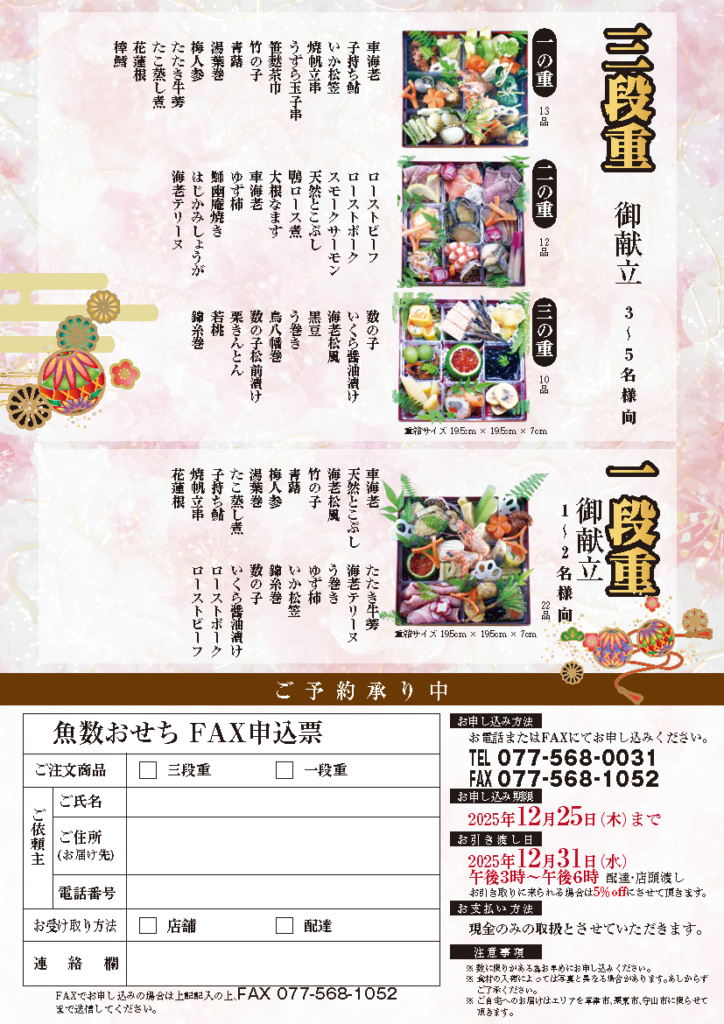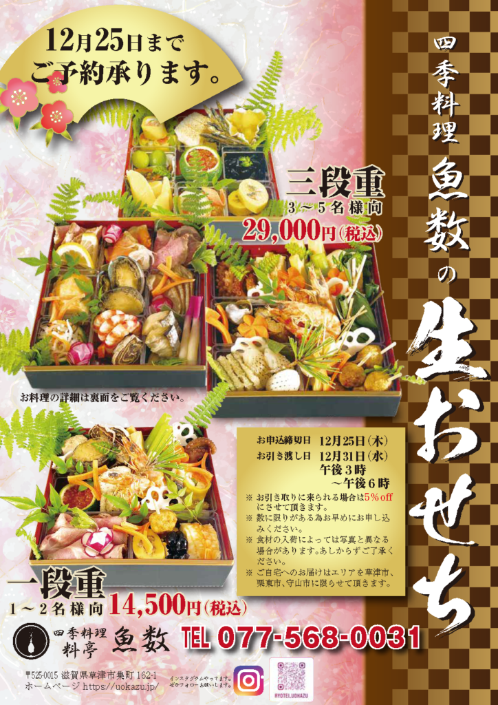 毎年恒例の料亭魚数の『生おせち』ご予約承り中